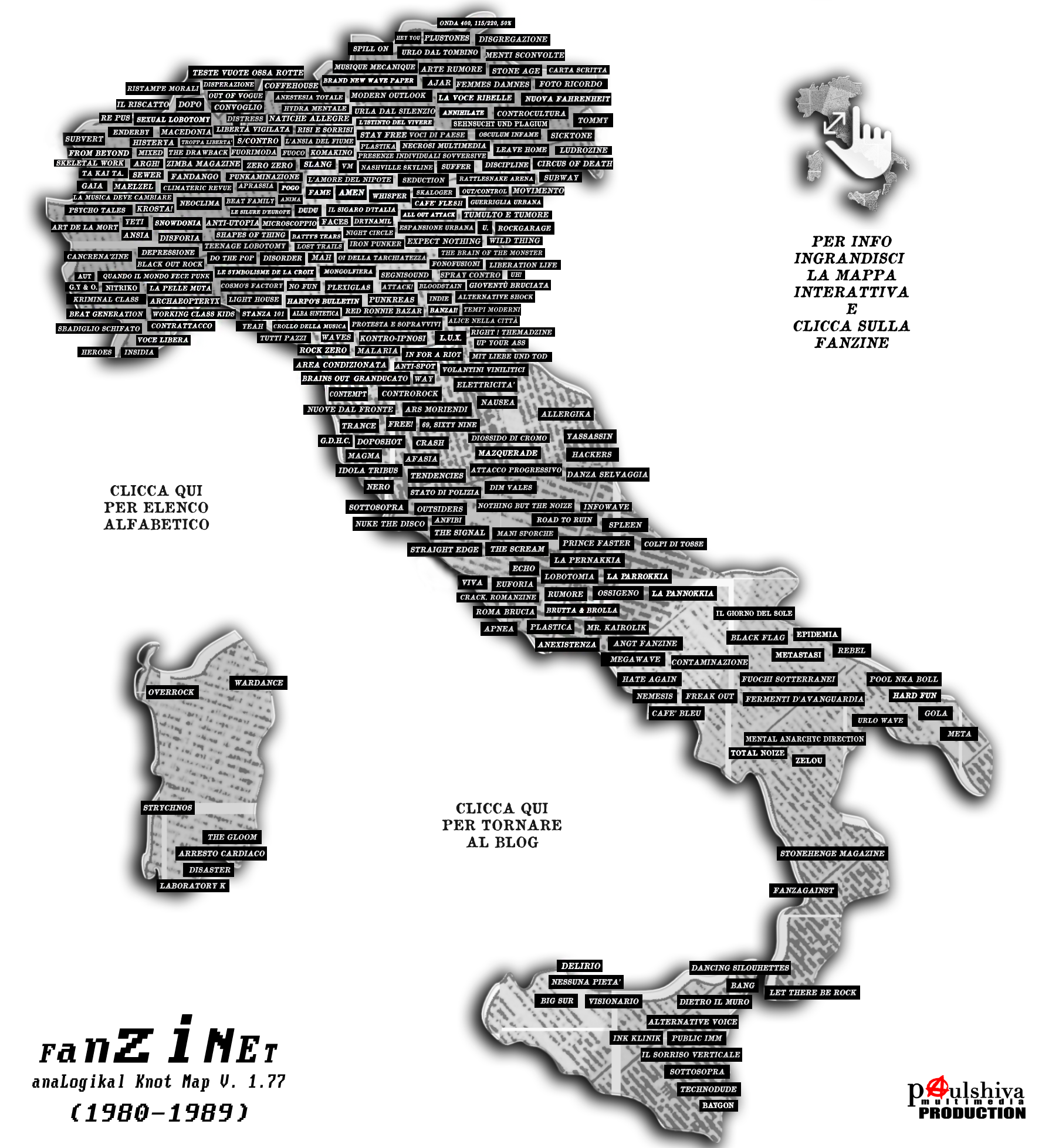 Mappa delle Fanzine Italiane degli anni 80 ROCKGARAGE NUOVA FAHRENHEIT PUNKZINE SEXUAL LOBOTOMY ONDA 400 CIRCUS OF DEATH URLO DAL TOMBINO PLUSTONES HEY YOU SEDUCTION WHISPER ESPANSIONE URBANA EXPECT NOTHING FONOFUSIONI AMEN ADN - L'AMORE DEL NIPOTE ANIMA TEENAGE LOBOTOMY PUNKAMINAZIONE SHAPES OF THING TESTE VUOTE OSSA ROTTA LE SYMBOLISME DE LA CROIX VM NEOCLIMA FANDANGO SNOWDONIA MAELZEL PSYCHO TALES LA PELLE MUTA STANZA 101 ARCHAEOPTERTYX L.U.X. ELECTRIC PUNKREAS HARPO’S BULLETIN PLEXIGLAS DO THE POP FREE AREA CONDIZIONATA ARS MORIENDI CRASH CONTROROCK DOPOSHOT IDOLA TRIBUS NUOVE DAL FRONTE TENDENCIES NERO TRANCE DIOSSIDO DI CROMO MAZQUERADE DIM VALES THE SCREAM VIVA THE SIGNAL PLASTICA MR. KAIROLIK ANEXISTENZA BRUTTA & BROLLA RUMORE ROAD TO RUIN URLO WAVE GOLA THE GLOOM CIRCUS OF DEATH DISGREGAZIONE SPILLON MENTI SCONVOLTE MUSIQUE MECANIQUE ARTE RUMORE STONE AGE CARTA SCRITTA BRAND NEW WAVE PAPER AJAR FEMMES DAMNES FOTO RICORDO MODERN OUTLOOK LA VOCE RIBELLE URLA DAL SILENZIO ANNIHILATE CONTROCULTURA TOMMY L'ISTINTO DI VIVERE SEHNSUCHT UND PLAGIUM STAY FREE VOCI DI PAESE OSCULUM INFAME SICKTONE PLASTIKA NECROSI MULTIMEDIA LEAVE HOME CRONACHE LUDRE PRESENZE INDIVIDUALI SOVVERSIVE NASHVILLE SKYLINE SUFFER DISCIPLINE RATTLESNAKE ARENA SUBWAY SKALOGER OUT/CONTROL MOVIMENTO CAFE' FLESH GUERRIGLIA URBANA ALL OUT ATTACK TUMULTO E TUMORE U. WILD THING THE BRAIN OF THE MOSTER LIBERATION LIFE SPRAY CONTRO OI DELLA TARCHIATEZZA IRON PUNKER NIGHT CIRCLE DRYNAMIL IL SIGARO D'ITALIA FAME SLANG KOMAKINO L'ANSIA DEL FIUME RISI E SORRISI NATICHE ALLEGRE HYDRA MENTALE ANESTESIA TOTALE COFFEHOUSE DISPERAZIONE OUT OF VOGUE CONVOGLIO DISTRESS LIBERTA' VIGILATA S/CONTRO FUORIMODA FUOCO ZERO ZERO APRASSIA POGO BEAT FAMILY LE SILURE D'EUROPE DUDU ANTI-UTOPIA MICRO-SCOPPIO FACES BATTY'S TEARS LOST TRAILS DISORDER MAH MONGOL-FIERA SEGNISOUND DOPO IL RISCATTO RE PUS SUBVERT ENDERBY MACEDONIA HISTERYA TROPPA LIBERTA' THE DRAWBACK ZIMBA MAGAZINE MIXED ARGH! TA KAI TA. SEWER GAIA CLIMA LA MUSICA DEVE CAMBIARE KROSTA! ART DE LA MORT YETI ANSIA DISFORIA CANCRENAZINE DEPRESSIONE BLACK OUT ROCK QUANDO IL MONDO FECE PUNK KRIMINAL CLASS BEAT GENERATION SBADIGLIO SCHIFATO HEROES INSIDIA VOCE LIBERA WORKING CLASS KIDS CONTRATTACCO COSMO'S FACTORY NO FUN ATTACK! BLOODSTAIN LIGHTHOUSE INDIE ALTERNATIVE SHOCK ALBA SINTETICA RED RONNIE BAZAR BANZAI! TEMPI MODERNI YEAH! CROLLO DELLA MUSICA PROTESTA E SOPRAVVIVI ALICE NELLA CITTA' TUTTI PAZZI WAVES KONTRO-IPNOSI RIGHT! THEMADZINE UP YOUR ASS ROCK ZERO MALARIA IN FOR A RIOT MIT LIEBE UND TOD ANTI-SPOT VOLANTINI VINILICI BRAINS OUT GRANDUCATO Granducato Hardcore CONTEMPT WAY ELETTRICITA' NAUSEA 69 SIXTY NINE ALLERGIKA MAGMA AFASIA YASSASSIN HACKERS ATTACCO PROGRESSIVO DANZA SELVAGGIA STATO DI POLIZIA SOTTOSOPRA OUTSIDERS NOTHING BUT THE NOIZE NUKE THE DISCO MANI SPORCHE STRAIGHT EDGE SPLEEN PRINCE FASTER LA PERNAKKIA ECHOZINE LOBOTOMIA EUFORIA QUELLI DI CRACK! ROMA BRUCIA APNEA OSSIGENO ANGT FANZINE MEGAWAVE HATE AGAIN CONTAMINAZIONE NEMESIS CAFE' BLEU FREAK OUT BLACK FLAG FUOCHI SOTTERRANEI FERMENTI D'AVANGUARDIA REBEL POOL BOOL META STONEHENGE MAGAZINE FANZAGAINST DANCING SILOUHETTES LET THERE BE ROCK BANG DIETRO IL MURO ALTERNATIVE VOICE PUBLIC IMM INK KLINIK IL SORRISO VERTICALE SOTTOSOPRA TECHNODUDE NESSUNA PIETA' BIG SUR VISIONARIO WARDANCE OVERROCK STRYCHNOS ARRESTO CARDIACO DISASTER RISTAMPE MORALI DELIRIO COLPI DI TOSSE GIOVENTU' BRUCIATA UH! INFOWAVE ANFIBI SKELETAL WORK FROM BEYOND ELENCO ALFABETICO FANZINE BLOG MENTAL ANARCHIC DIRECTION LABORATORY K TOTAL NOIZE ZELOU HARD FUN LA PARROKKIA LA PANNOKKIA EPIDEMIA METASTASI IL GIORNO DEL SOLE BAYGON NITRIKO G.Y. & O. AUT
