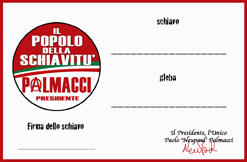 L'imminente Congresso Destituente del Popolo della Schiavitù (29 maggio, Milano, Marriott Hotel) sarà totalmente autofinanziato. Il Popolo tutto può aiutarci nel far fronte alle spese organizzative acquistando la Maglietta del Popolo e/o la Tessera del Popolo (che dà diritto a partecipare ai lavori congressuali) e/o aderendo alla campagna "Io Sono Spartaco" devolvendo una quota volontaria al Popolo della Schiavitù.